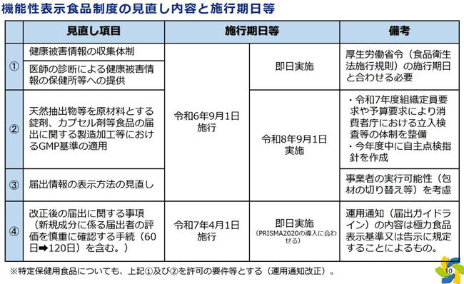 GMPの義務化に関しては、届出者が自主点検をするとともに、2026年9月1日以降、消費者庁が必要な体制を整備した上で食品表示法に基づく立入検査等を行うこととなっています。 |