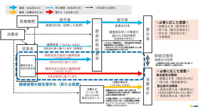 | 機能性表示食品の届出者は、健康被害と疑われる情報を収集し、健康被害と疑われる情報(医師が診断したものに限る。)を把握した場合は、当該食品との因果関係が不明であっても速やかに消費者庁長官及び都道府県知事等に情報提供することが義務付けられました。 |